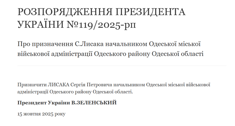 Очільником новоствореної Одеської міської військової адміністрації стане нинішній голова Дніпропетровської ОВА Сергій Лисак. Відповідний указ уже підписав президент Володимир Зеленський. Після втрати українського громадянства Геннадієм Трухановим його мерські повноваження будуть припинені, однак остаточне рішення має ухвалити Одеська міськрада.