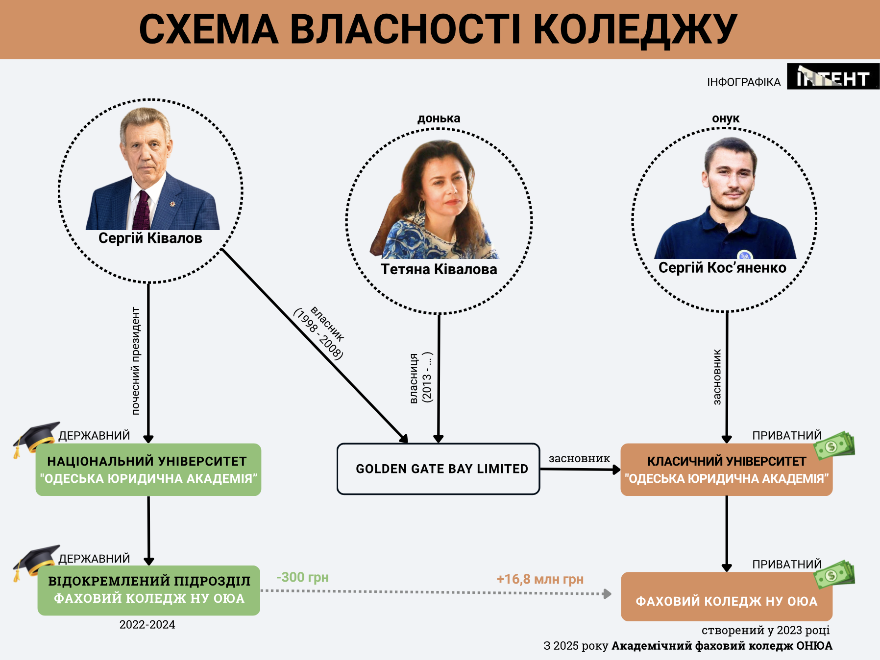 Як йдеться у розслідуванні Інтенту, у 2022 році Національний університет "Одеська юридична академія" відкрив відокремлений підрозділ державного коледжу (Фаховий коледж НУ "ОЮА"). Його діяльність офіційно припинили у вересні 2024 року. Паралельно у жовтні 2023-го в реєстрі з’явився новий приватний навчальний заклад зі схожою назвою – "Фаховий коледж Національного університету “Одеська юридична академія". Він працює за тією ж адресою, що й колишній державний підрозділ – на вул. Академічна, 7Б.